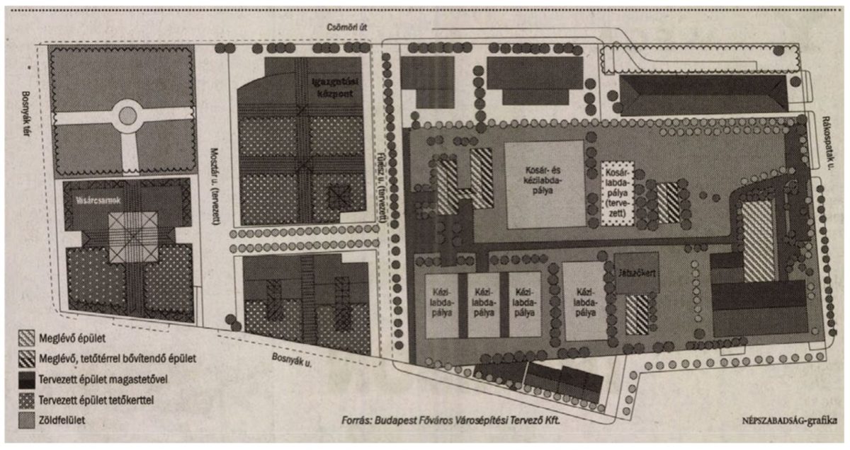Látszik, hogy ebben messze túlsúlyban vannak a közfunkciók és a zöldterületek a megjelenő magánfejlesztések mellett. Az addigra elavultnak érzett régi helyett új vásárcsarnok, új igazgatási épület (vagyis városháza) és rengeteg megtartott sportpálya jelenik meg a terven, amely a megnyitott terekkel még valóban szerves kapcsolatot teremtett volna a régi Bosnyák térrel, illetve a zöld- és sportterületek révén harmonikus átmenetet kínált volna a Rákos-patak felé. Azt is mondhatjuk: ez az a terv, aminek a Zaha Hadid Architects mesterterve utóbb hazudta magát.