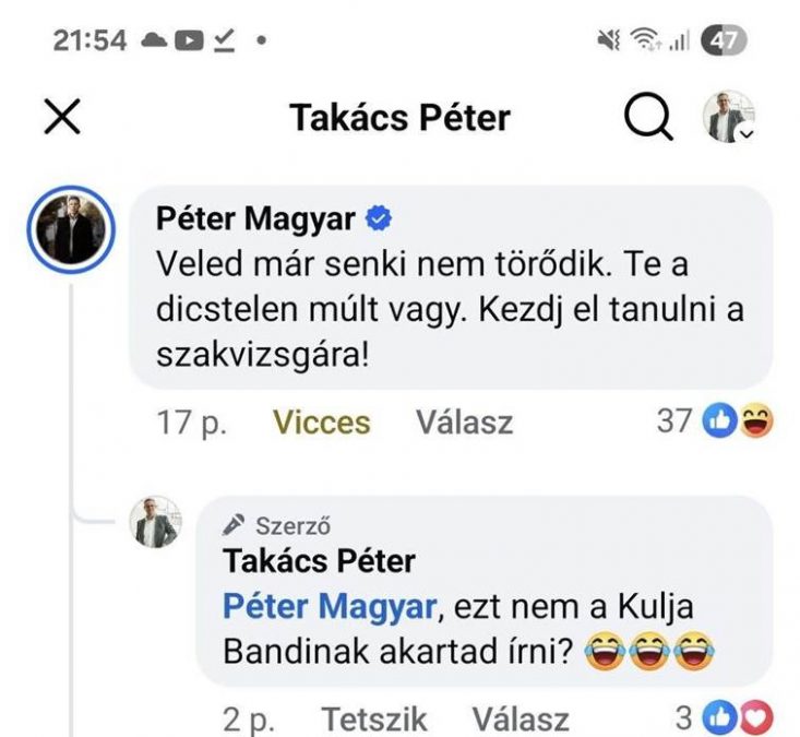 Majd megjelent a Facebookon a tiszás politikus válasza Takács Péternek: „Amikor az egészségügyi államtitkár szellemi akrobatikus ficammal azt állítja, hogy Magyar Péter a Magyar Orvosi Kamara elnökét kérte fel, hogy a TISZA nevében vitázzon vele élő adásban a Válasz Online szervezésében, az nemcsak a politikai összeesküvés-elméletek teljes eluralkodásáról tanúskodik az államtitkárnál, hanem azt is jelzi, hogy értékítélete megbomlott, és szakpolitikai szerepkörben való alkalmazása is súlyos kockázatokat hordoz magában. Nem tájékozódott, és ismét hazugságot, illetve álhírt gyárt és oszt meg. (Holott, ha bizonytalan egy hír hátteréről, első kézből tájékozódhatna a kamara elnökétől, vagy akár a vita felkérését intéző újságírótól.)”