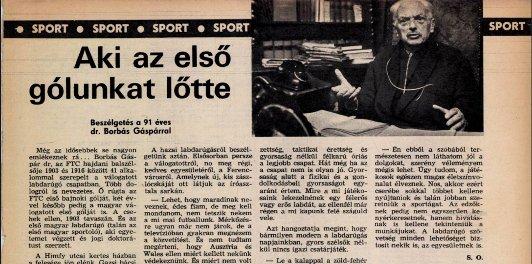 Így került S. O. dédapám, a 91 éves dr. Borbás Gáspár vendégségébe, és a hallottakat az Aki az első gólunkat lőtte című rövidke írásban örökítette meg. A modern futballt családi körben és nyilvánosan is finoman, tartózkodóan kommentáló egykori csatár ezúttal lendületbe jött: