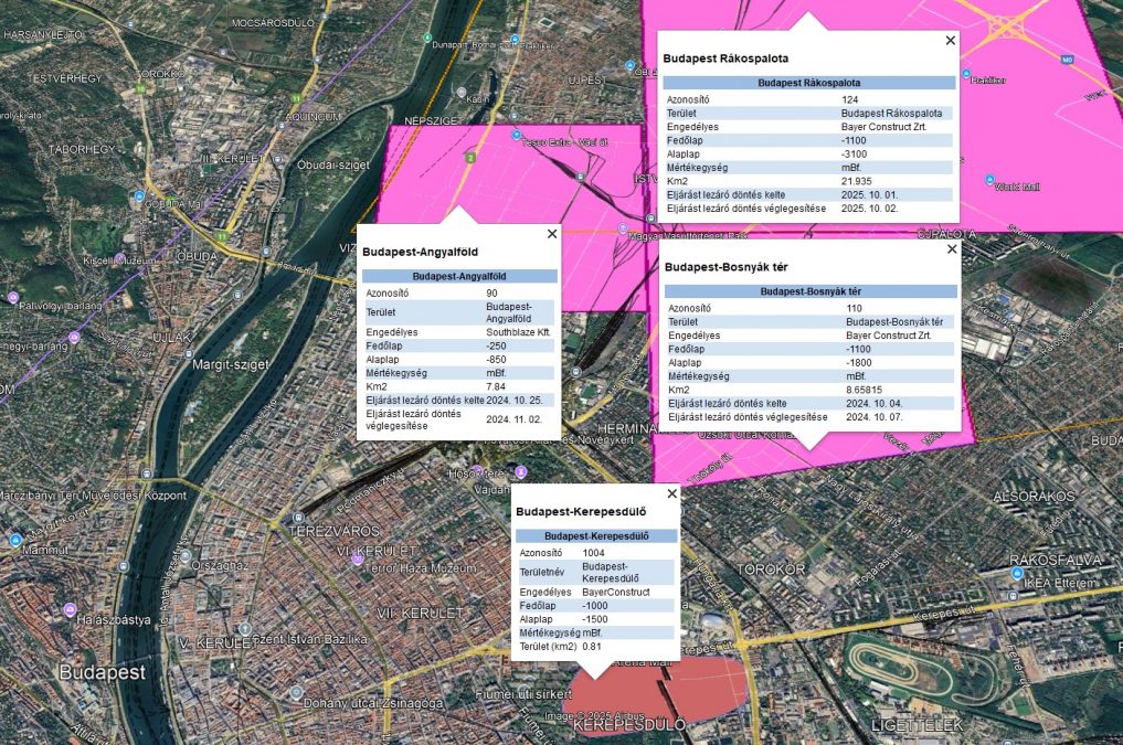 A geotermikus kutatási engedélyeket 2023 óta a Szabályozott Tevékenységek Felügyeleti Hatósága (SZTFH) adja ki, és egy folyamatosan frissülő, Google Earth alapú térképen lehet nyomon követni, hogy ki kapott ilyen jogosítványokat. Budapesten jelenleg így néz ki a térkép: