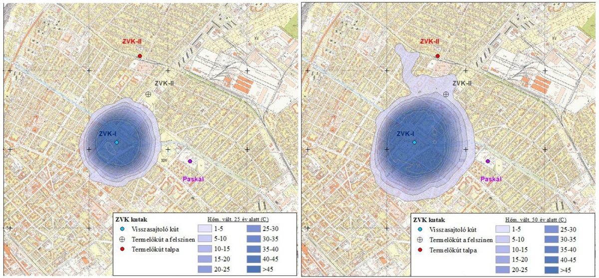 Erre az a magyarázat, hogy a modellezés szerint a Paskál kutat a hőmérsékleti hatás, vagyis a ZVK-I körül kialakuló hideglencse nem éri el, sem 25, sem 50 év múlva. Ezt két ábrán be is mutatják: