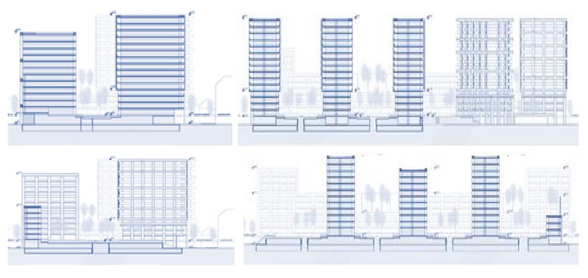 A szalagházzal szemben, a Harisnyagyár felőli oldalon további négy tizenötemeletes magasház tornyosul majd; az nyilván a vicc kategória, hogy ezek egy városias sétány térfalát alkothatnák. A lakótornyok méretéhez képest a védett épület eljelentéktelenedik, elveszíti városképileg meghatározó szerepét, szinte ugyanaz ismétlődik majd meg, mint a BUSZESZ meghagyott ipari mementóinál. A beépítés falanaszter jellegét ezúttal is a keresztmetszeti rajzok érzékeltetik legjobban:
