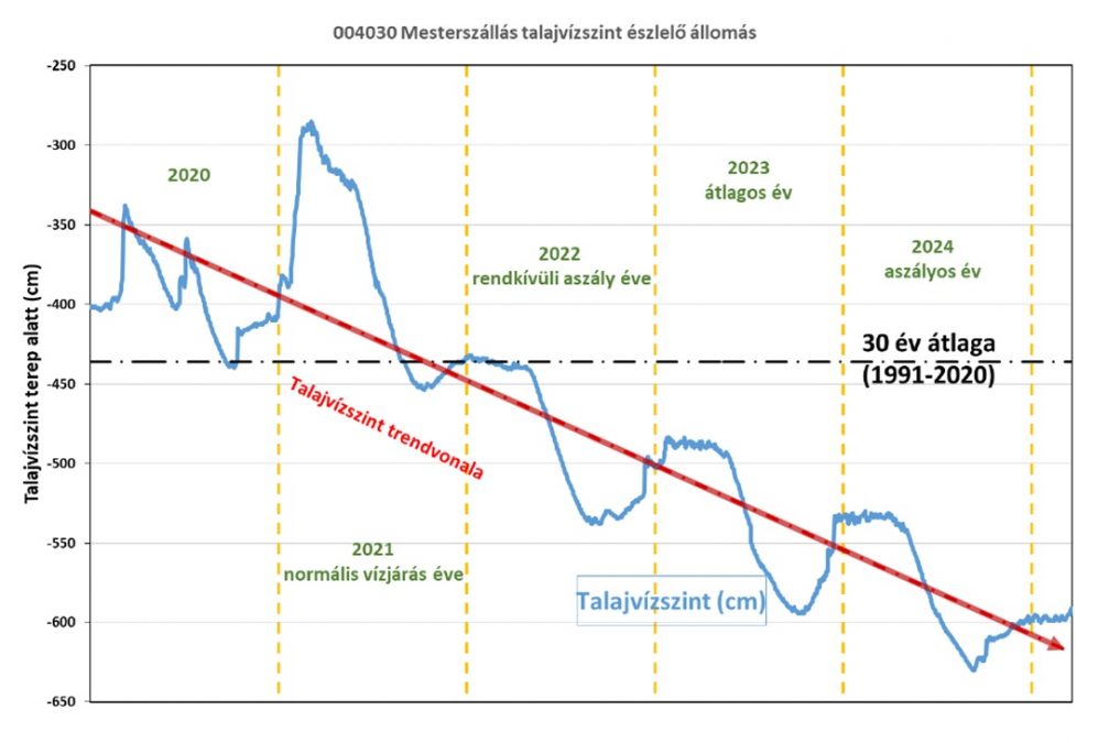 A képen a piros árnyalatai jelzik, hol süllyedt mélyebbre a talajvíz a korábbi átlaghoz képest. Az Alföldön számtalan mérőpontnál 2-3 méteres esést látunk. A teljes felszín alatti készlethiány elérheti a tíz Balatonnyi vízmennyiséget. E hiány egyik fő okozója (a rengeteg kút mellett) a téli hóban tárolt vízkészlet drasztikus csökkenése az utóbbi évtizedekben. Ha kisebb léptékben szeretnénk látni a folyamatot, érdemes felidézni a Víz a tájban – Klímaadaptáció konfliktusokkal című tavaly novemberi konferencián idézett egyik grafikont, mely a Jász-Nagykun-Szolnok megyei Mesterszállás község talajvízszint-észlelő állomásának adatait szemlélteti. A kék görbe a vízszinté, a szaggatott vonal a harmincéves átlag, a piros pedig a trend.
