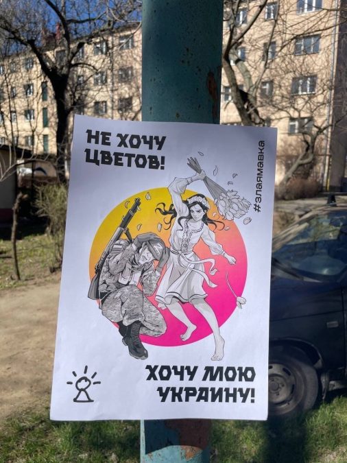 Egy – a mai napig – megszállt területen élő hölgy mesélt nekünk arról, hogyan vonultak végig az orosz katonák 2023. március 8-án, nemzetközi nőnapon Melitopol utcáin, és osztogattak virágcsokrokat a hölgyeknek. A gesztust arra találták ki, hogy a megszállók és a helyi lakosság közötti viszonyt jó fényben tüntesse fel. Csakhogy néhány helyi nő csendben megelőzte őket. Egy nappal korábban rózsaszín és sárga plakátok tucatjait ragasztották fel a város lámpaoszlopaira, falaira. A posztereken egy hagyományos ukrán ruhába öltözött nő virágcsokorral vág fejbe egy orosz katonát. Alatta a nagybetűs felirat: „Nem kell nekünk virág. Ukrajnát akarjuk visszakapni!”