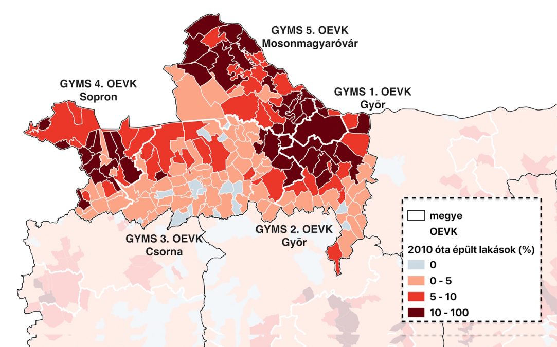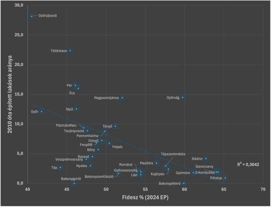 Különösen gyengén szerepelt a Fidesz a 2024-es EP választáson azokon a településeken, ahol viszonylag sok új ház épült 2010 óta. Győrújbarát például közkedvelt agglomerációs célterület, a település teljes lakásállományának több mint 27 százaléka 2010 óta épült, és a község lakossága is 30 százalékkal emelkedett azóta, sorra épülnek ma is az új lakóingatlanok. A Fidesz ehhez képest -14 százalékpontnyi választót veszített 2024-re, miközben a Tisza Párt már mindössze 2 százalékpontnyi lemaradásban volt itt az EP-választáson. Azaz pont úgy szavaztak itt az emberek, mint Győr északi, 1-es OEVK-ba tartozó részein. Egészen drámai volt a helyzet Nyúlon is, ahol a Fidesz két év alatt több mint -27 százalékpontot esett vissza, a párt támogatottsága 70 százalékról zuhant 43-ra.