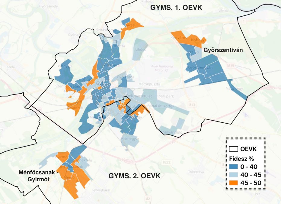 Ezek a települések azért lesznek fontosak a kampányban, mert a választók csupán harmada szavaz 3 ezer főnél alacsonyabb lélekszámú településen, míg 44 százalékuk Győrben él, szóval könnyen lehet a mérleg nyelve a déli agglomerációs gyűrű. Győr kapcsán azért érdemes megjegyezni, hogy a Fidesz számára valamivel kedvezőbb városrészek kerültek ebbe a 2-es OEVK-ba. A 2011-es határrajzolásnál még úgy kalkulálhattak a térkép felett állók, hogy a korábban markánsan balra szavazó panel lakótelepeket (Adyváros, Marcalváros egyik fele) érdemes összevonni a vidékiesebb részekkel, azonban azóta például Adyváros vált a Fidesz legbiztosabb győri bázisává. Szintén itt található a várostól fizikailag elkülönülő, vidékiesebb jellegű Ménfőcsanak és Gyirmót, ahol hagyományosan erősebb a kormánypárt, habár Ménfőcsanak kertvárosias, újabb beépítésű három szavazókörében már többségben volt a Tisza 2024 júniusában.
