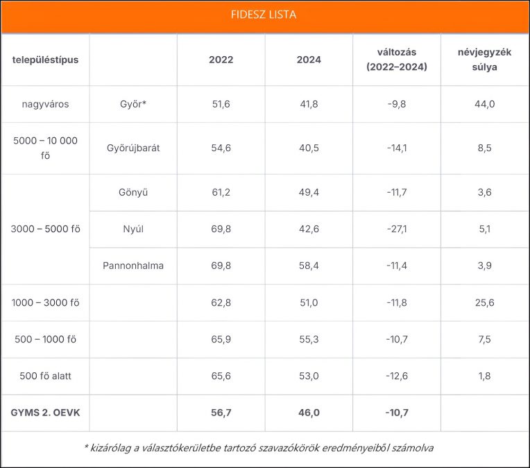 A Fidesz társadalomszervezési elképzelésének egyik bezzegterületén éppen ezért okozott nem kis meglepetést 2024. június 9. éjszakája. A fideszes polgármester elbukott Győrben és Mosonmagyaróváron, utóbbiban a közgyűlési többséget is elveszítette a kormánypárt. Az EP-választás pártlistás eredményei alapján -9,2 százalékponttal esett vissza a Fidesz a 2022-es listás eredményéhez képest, ami a harmadik legnagyobb megyei zsugorodása volt a pártnak országosan. Csak Hajdú-Biharban és Pest megyében bukott fajlagosan több választót a kormánypárt, de a 2019-es EP-választáshoz képest ténylegesen itt estek a legnagyobbat (-11,2%).