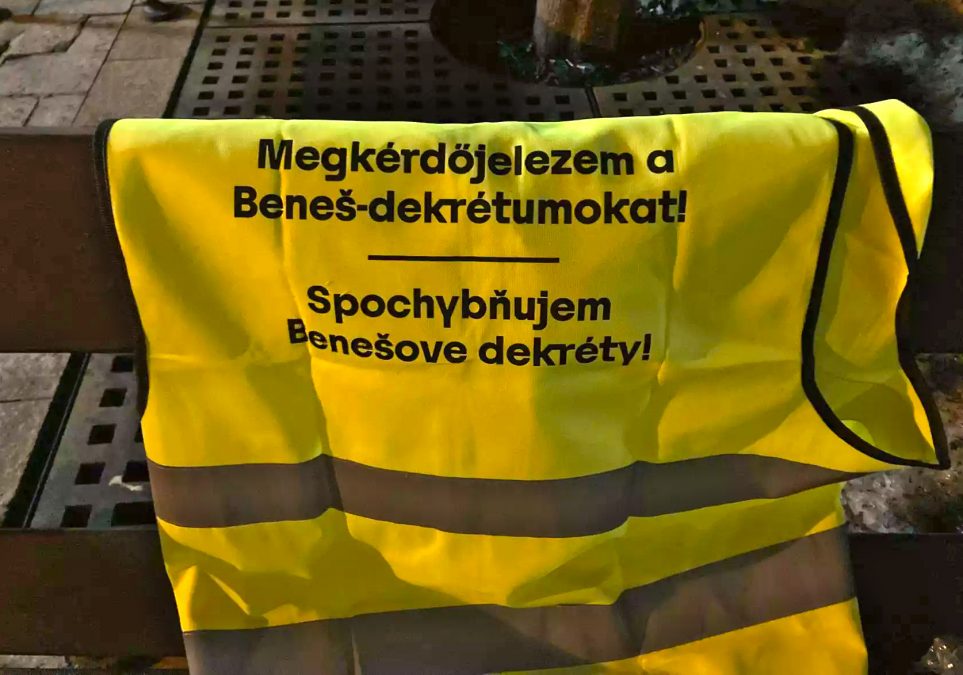 – A demonstráció előtti egyeztetéseken a rendőrség leszögezte, hogy bizonyos mondatok nem hangozhatnak el: szerintük a „tagadom/megkérdőjelezem Benes-dekrétumokat” azt jelenti, hogy a dokumentumok fizikai létezését vonjuk kétségbe. Ez jogi és történelmi nonszensz, ilyet senki sem állít. Nekünk pont az a bajunk, hogy a dekrétumok nagyon is léteznek és mai napig alkalmazzák őket vagyonelkobzások jogi alapjaként! A tüntetés előtt olyan láthatósági mellényeket osztottunk ki, amin magyarul és szlovákul is az szerepelt, hogy „Megkérdőjelezem a Beneš-dekrétumokat!” Mivel a rendőrség jelezte, oszlatni fognak, ha a résztvevők nem veszik le a mellényeket, a demonstráció megtartása érdekében megkértük a résztvevőket ruhadarab eltávolítáásra. Orosz Örs magán hagyta a mellényt, ezért állították elő, de szerencsére gyorsan elengedték a rendőrörsről.