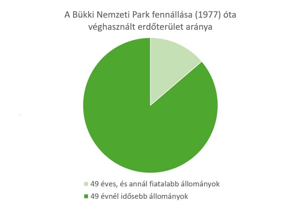 Ezen az látszik, hogy a Bükki Nemzeti Parkban – az ország legnagyobb erdős nemzeti parkjában – az erdők ötödét letermelték már a park 1977-es alapítása óta. Ahogy azt korábban is jeleztük, a fokozottan védett területek kivételével szinte minden erdőre ilyen sors vár előbb-utóbb a védett területeken, így az ábra végső soron semmi meglepőt nem tartalmaz. A nemzeti parkok létrehozása csupán befékezte a fakitermelés ütemét, de nem változtatott az alapvető helyzeten.