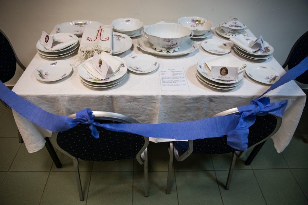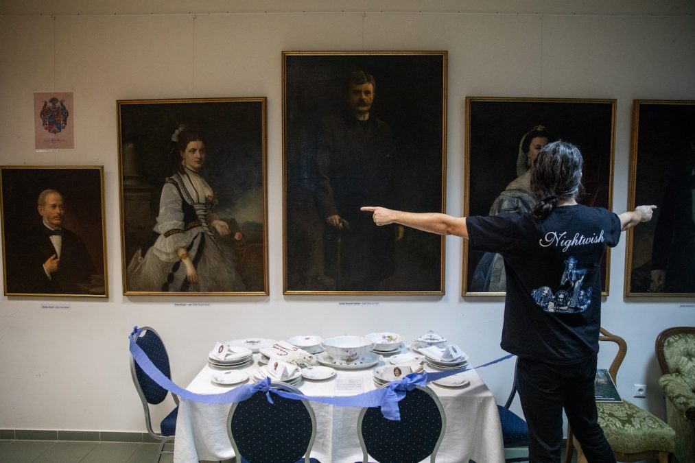 Miközben Kiss Gábor mesél, körbevezet a könyvtárba installált kiállításon. A hazatért festmények közül többet Horovitz Lipót, a dualizmus korának egyik legjobb portréfestője jegyez. (Horovitz Arany Jánosról, Jókai Mórról és Tisza Kálmánról készült arcképeit feltehetően mindenki látta már, a legtöbb tankönyvben szerepelnek.) Emellett visszakerült több mint 200 fotó, több dossziényi levelezés, dokumentum, könyvek, személyes tárgyak, bőröndök. – Ez az étkészlet is? – kérdezzük az egyik asztal mellett állva. – Nem, ezt helyiek adták. Vecsési Facebook-csoportokban hirdettük, hogy akinek van valami az egykori kastélyból, jelentkezzen. És hát jelentkezett – fejti ki a történész.