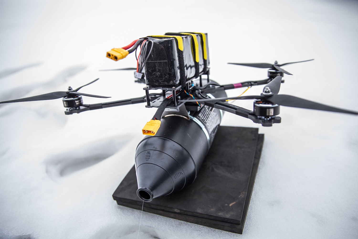 Három beosztottjával, Manfreddel, Pandával és Atappal a terepre megyünk tesztelni. A kvadrokopteren az akkumulátoron kívül rajta az optikai kábel dobja, a robbanótöltetet ez alá szerelik. A dobban 15 kilométernyi üvegszál van felcsévélve – 10 kilométerenként 1 kilót nyom –, a kábel másik végpontja a pilóta távirányítója. Tesztelni gyorsan kell, mert a kábel egyszer használatos: annyival rövidebb a hatótávolság, amennyi itt, a próbarepülés alatt elfogy.
