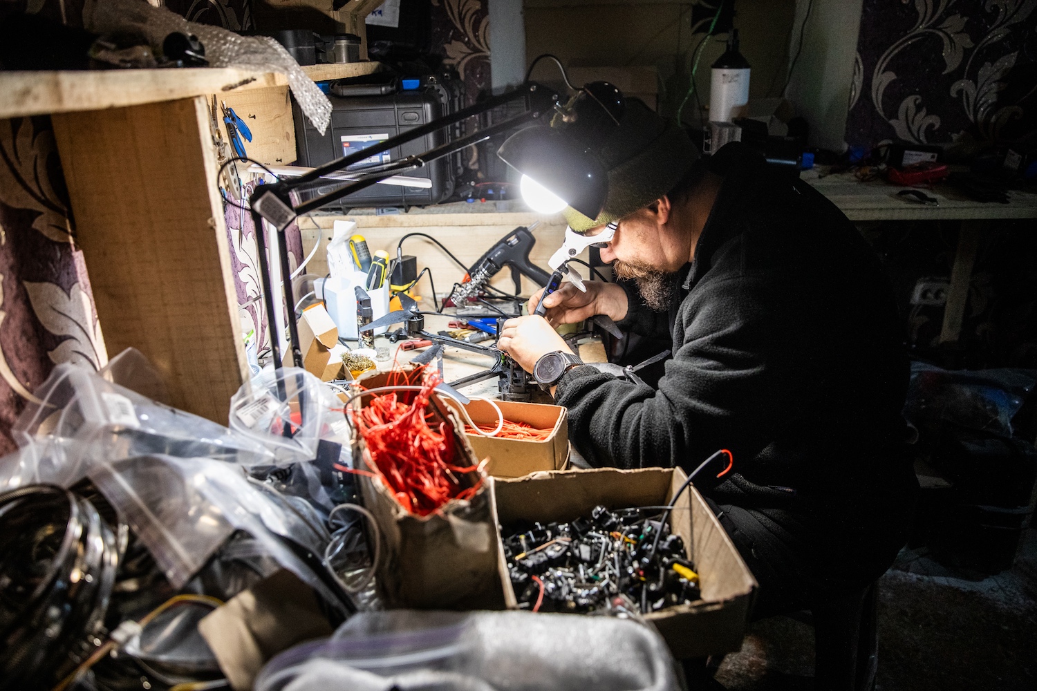A műhely rangidőse a reszelős hangú Ekszpert, aki 2022-es berukkolása előtt 20 éven át dolgozott Kijevben, az Ukrán Tudományos Akadémia Elektrodinamikai Intézetében. Kicsit szerényebb ez a közeg, mint a fővárosi gigantikus szovjet épületben: a szűk helyiségen 4-5 drónos – és néhány macska – osztozik. Ilyenkor, amikor nem a fronton szolgálnak, a beérkező eszközöket kalibrálják, aztán tesztelik is őket. A drónok döntő többsége már az elektronikai zavarásra immunis optikai üvegszálas. Utánpótlástól függően