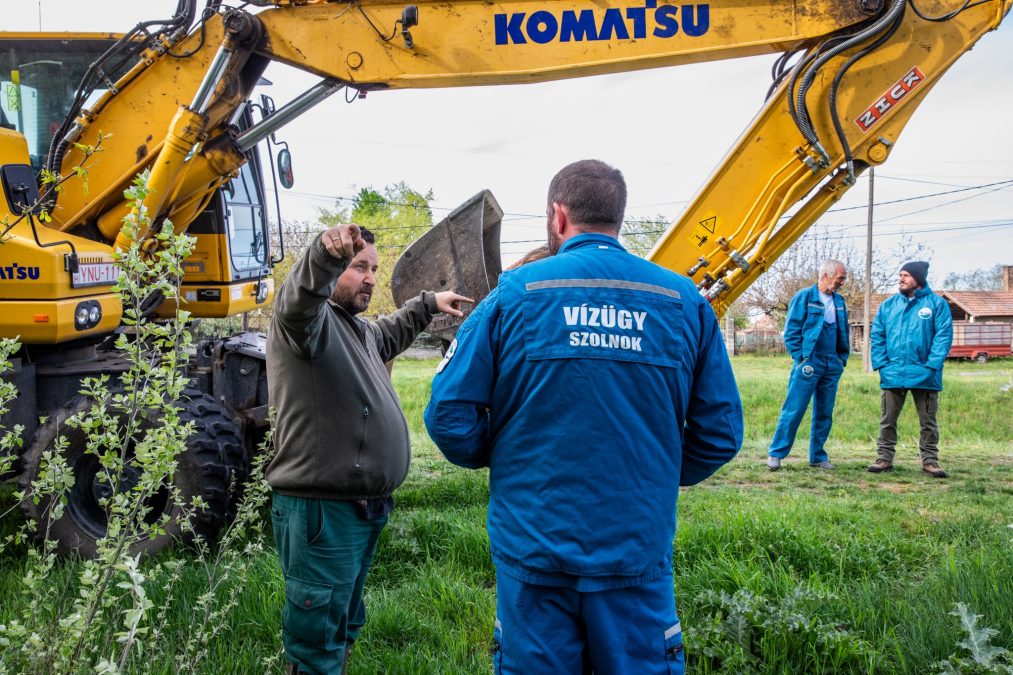 Eleinte semmilyen kapcsolatunk nem volt a Közép-Tisza-vidéki Vízügyi Igazgatósággal, aztán fokozatosan kiléptünk az illegalitásból és a félhomályból, elkezdtük velük a párbeszédet. És eljutottunk odáig, hogy már közösen dolgozunk. A választás előtti héten tizenhárom ilyen küszöböt csináltunk meg velük együtt. Ezt folytatjuk most – mutat a Gerje-patak hídjánál éppen beforduló KÖTIVIZIG-es kanalas forgókotróra.